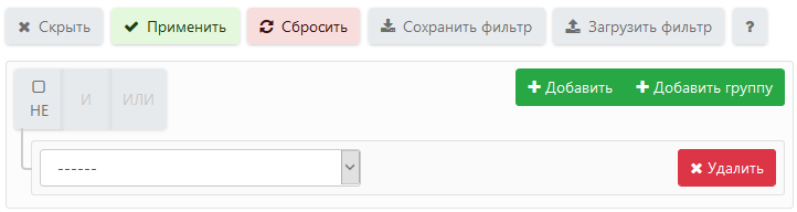 При добавлении дополнительного поля фильтра доступен выбор логических элементов И, ИЛИ в сочетании с логическим элементом НЕ.
