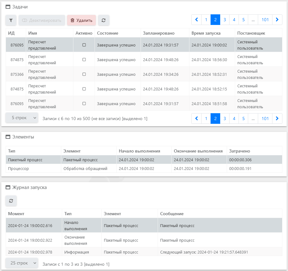 Интерфейс Журнал планировщика модуля Администрирование предназначен для просмотра состояния созданных в системе заданий и детализированной информации о процессе их выполнения.