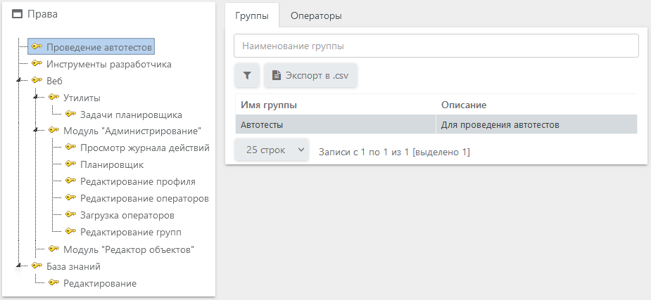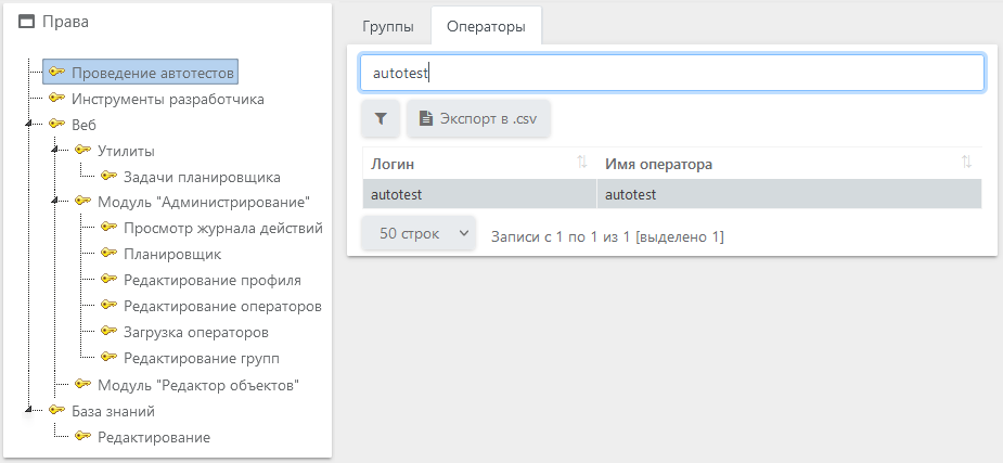 Для просмотра действующих прав оператора перейдите в интерфейс Операторы модуля Администрирование.