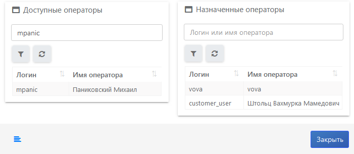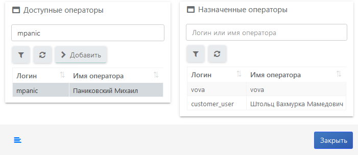 , которая вызовет окно формы Доступные/назначенные операторы.