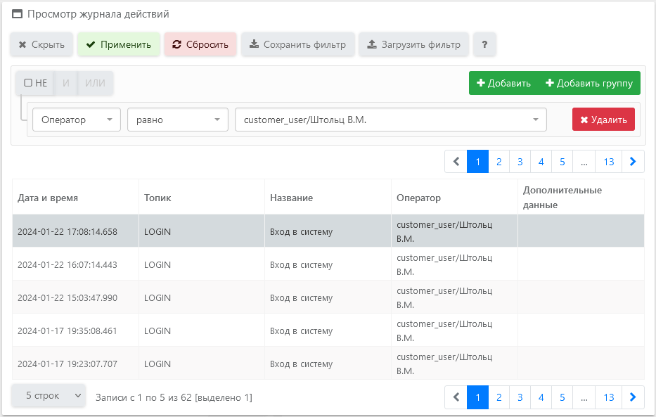 В результате отобразится интерфейс с информацией о действиях пользователей в системе.