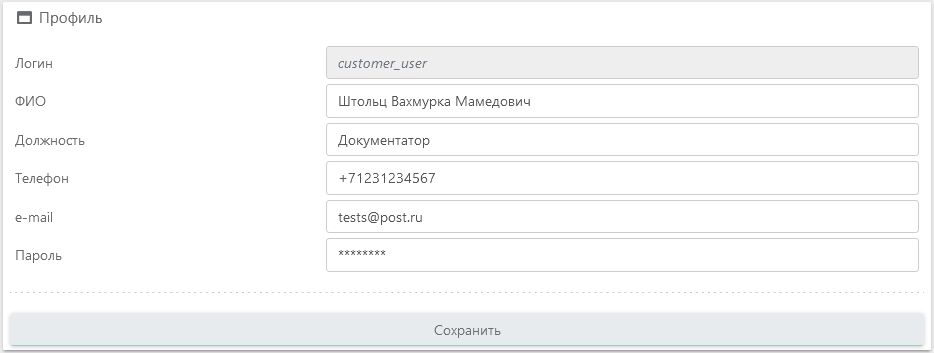 Интерфейс Профиль модуля Администрирование предназначен для редактирования параметров текущего (авторизованного) пользователя (ФИО, должность, контактная информация, пароль для входа в систему).